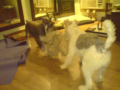 Quite serendipitously, we found two wire fox terriers in one of the shops. They were brothers, we've been told. Seven months old. Uh-oh. First sign of trouble. They're too old. I was looking out for a pup that was no more than 3 months. The Hubby conversed with the shop owner who told him that the two pups were from the "first batch" to be born here in Manila because the parents were directly imported from Italy. He said that 7-months is actually a good time to get a dog because by that time, all the "defects" as far as stance is concerned would have already shown. He went on and on and on about why we should get a wire fox terrier. Truth be told, I didn't want to get the fox terrier. The old adage "you can't teach old dogs new tricks" kept playing in my head. I thought it was weird that he did not seem to know how to walk. That he seemed to pee anytime he pleased. That--unlike all my other previous dogs including Buster J--he did not automatically approach me when I held out my hand. Instead, he ran away fearfully, his tail between his legs. I told Hubby Sweet my concerns, but I think the deal had been sealed long before we even stepped through the door. The P15K discount that he was willing to give should have tipped us off, but channeling Jerry Maguire, the shopowner actually had Hubby Sweet at hello. And so, if Buster J was my dog, Hubby Sweet was adamant that this was going to be his.